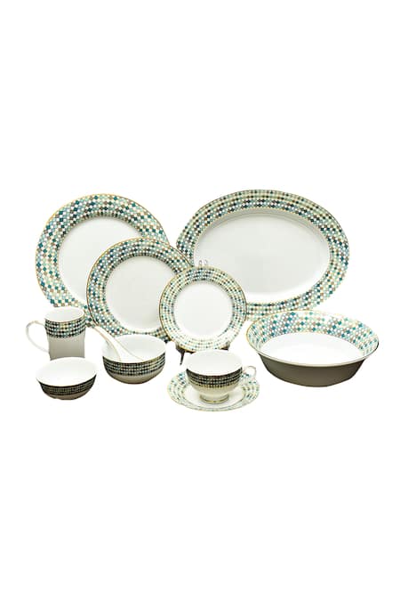 Teal dinner set with christolite mosaic prints and gold rims, includes 6 dinner plates, 6 quarter plates, 1 oval platter, 6 vegetable bowls, 2 salad bowls.