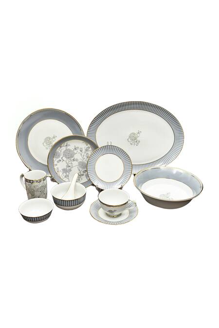 Grey Porcelain Floral, Striped Iris And Work Dinnerware Set