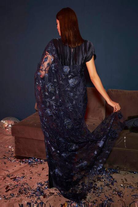 Blue pleated saree gown with floral embroidered mesh pallu.