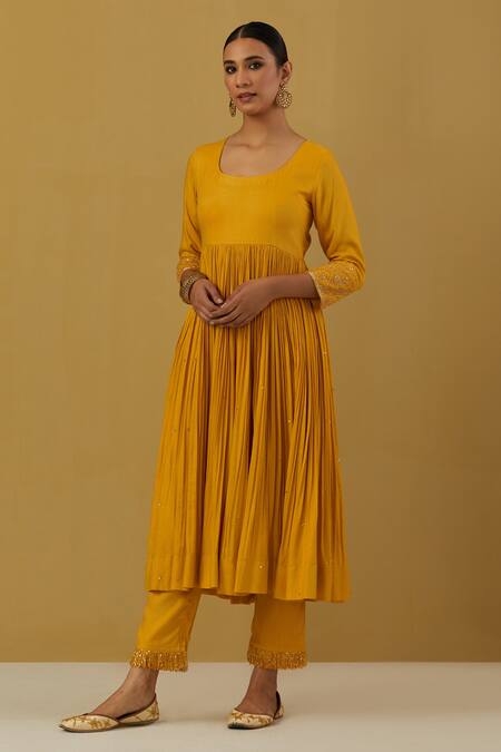 Yellow anarkali in cheese cotton base with embroidery. Paired with pant.