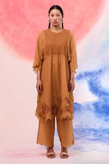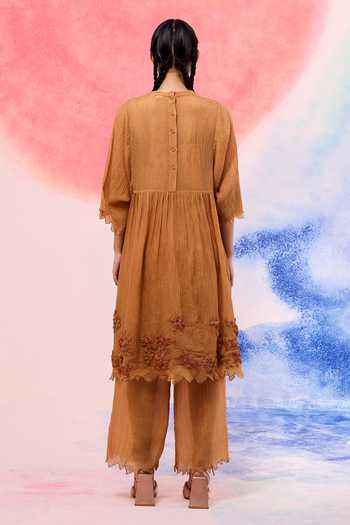 Tan Muslin Embroidery Round Neck Dune Riase Midi Dress