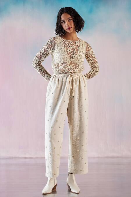 Off White Cotton Embroidery Heart Round Flower Foam Top And Pant Set