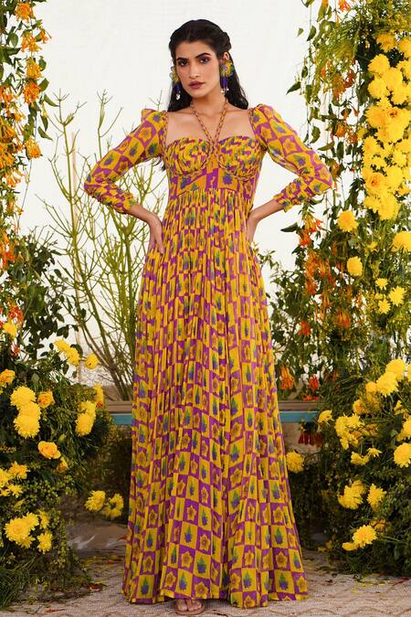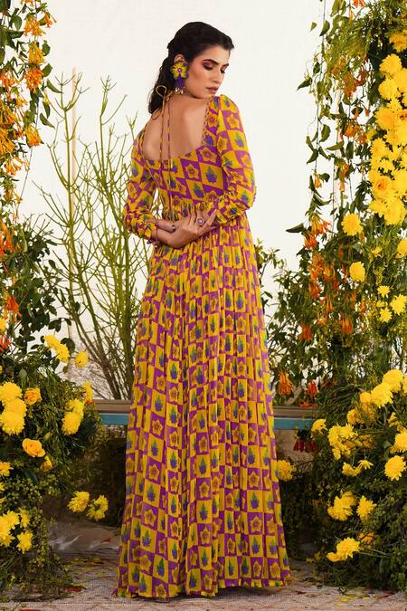 Purple & yellow floral print bustier gown with tie-up braided neck with tassels & gathered sleeves.