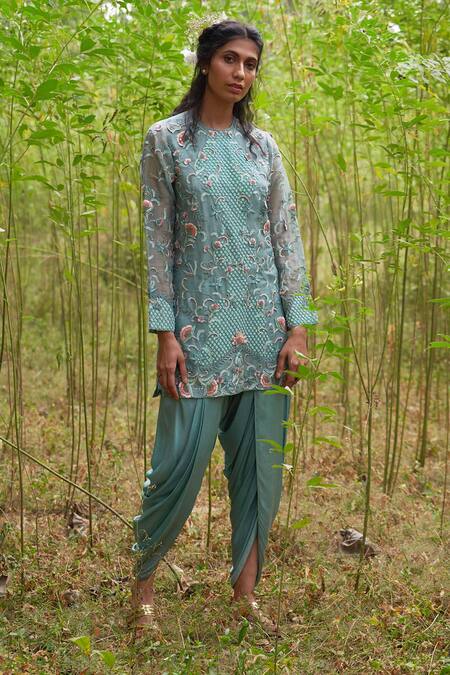 Light sea green short tunic with 3D floral motif kachcha resham thread & sequin work. Comes with dhoti-salwar.