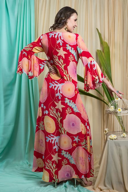 Red maxi dress featuring printed marine motifs highlighted with embellished cut dana placket