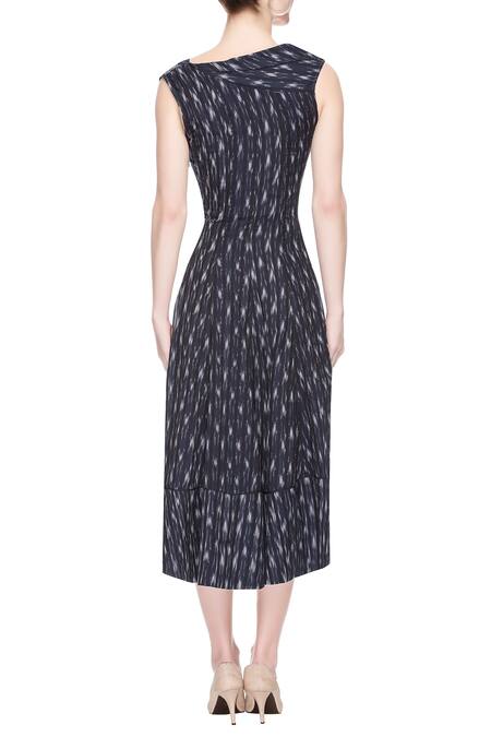 An indigo dress in an ikat weave is enhanced with an asymmetrical neckline. It is accentuated with foil embroidery at the bodice and fits true to its style.