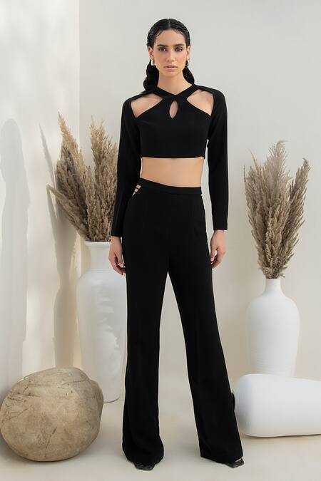 Black Italian Crepe V Neck Aarya Crop Top And Pant Set