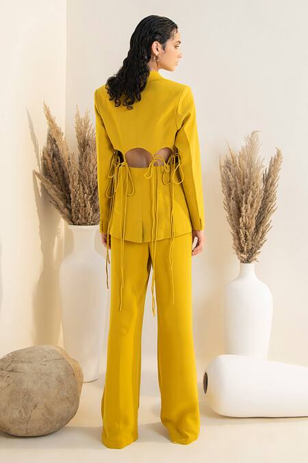 Sunflower mustard two buttoned blazer with back cut-out detailing and tie-up strings. Paired with boot-cut pant.