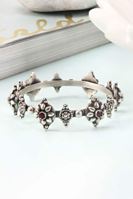 Silver oxidised bracelet featuring floral carved motifs and red stone embellishments