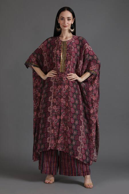 Wine kaftan featuring intricate multicolour honeycomb pattern with floral motifs and charm detail on placket. Paired with matching stripe print pant for a coordinated look.