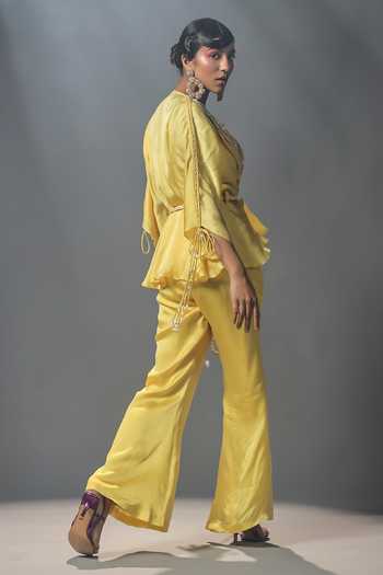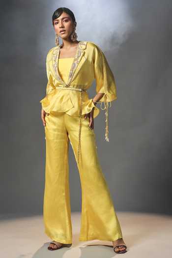 Yellow Organza Silk Floral Motifs Notched Lapel Collar Pant Set With Peplum Top