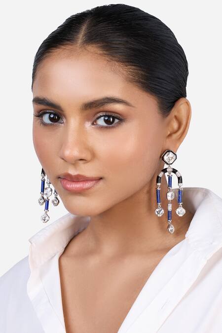 Designer blue chandelier earrings featuring crystal, cubic zircon, and blue lapis embellishments