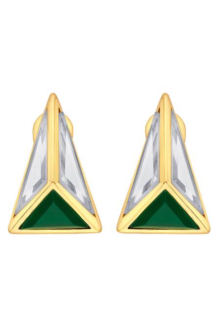 18kt gold plated pyramid shaped studs with green emerald hydro stone & mirror embellishment.