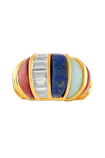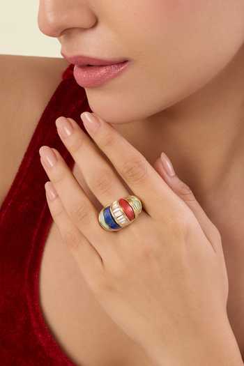 Tarot-inspired statement ring with high-quality crystals, amazonites, sand stones and lapis lazuli set in brass with 18k gold plating. Hypoallergenic design made to shine at weddings, festive gatherings, and cocktail nights.
