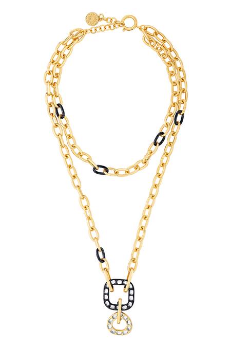 18Kt gold and rhodium plated with circle interlinked design, Embellished with mirror and cubic zirconia stones, Dimensions of necklace: 76.2 cm length x 5.4 cm width