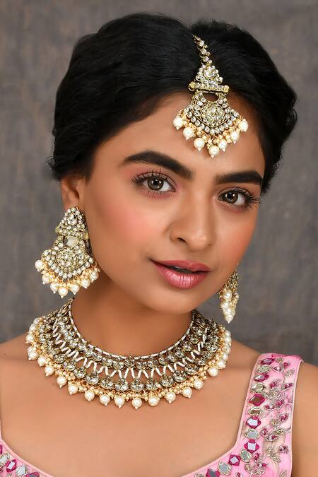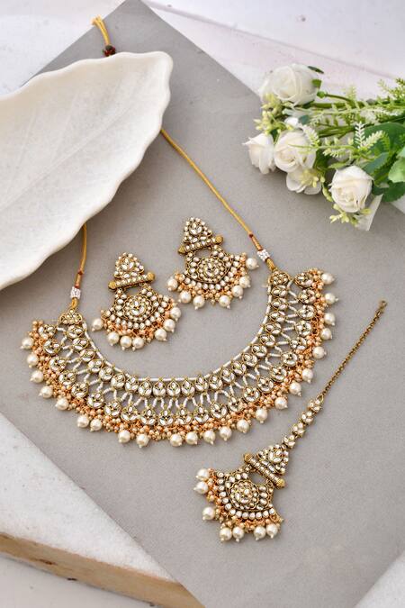 Gold toned choker featuring stone and bead embellishments. Paired with matching jhumkas and a maangtikka.