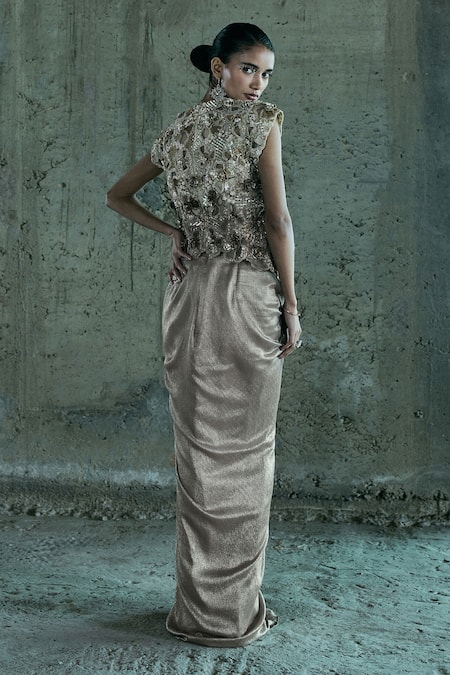 Cutwork embroidery, Draped skirt silhouette, Sequin embellishment