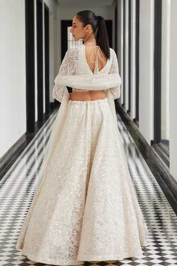 Ivory lehenga featuring all-over floral, sequins, and cutdana embroidery. Accompanied by a padded blouse and a dupatta with sequin butti embroidery.