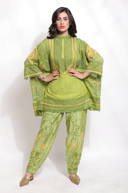 Green kaftan featuring a band collar with batwing sleeves and intricate hand embroidery. Paired with matching pants adorned with floral pattern embroidery.