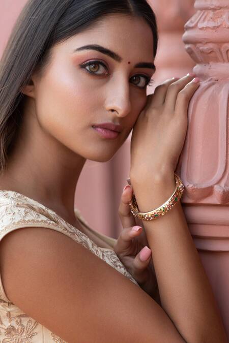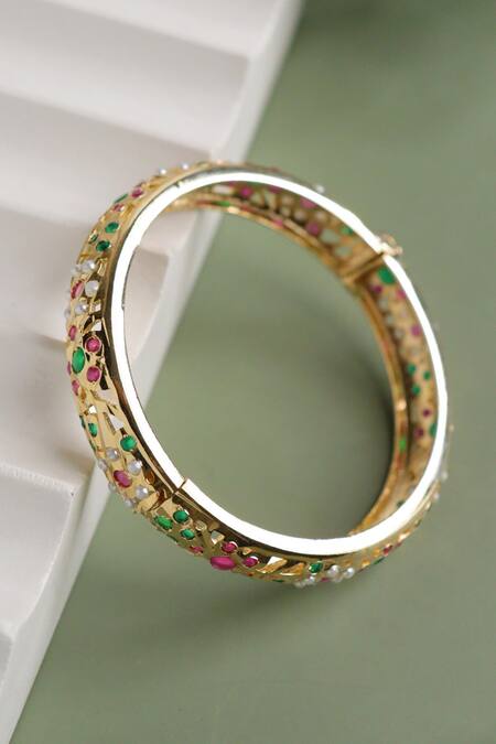22k gold toned bangle embellished with multicolor jadau stones and pearl detailing.