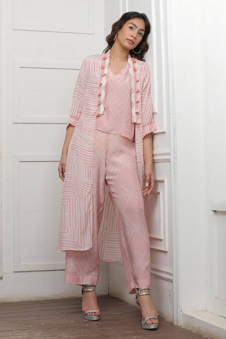 Pink Cotton, Silk Tassels Open Neck, Jagged Striped Pattern Jacket And Pant Set