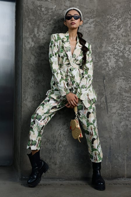 Green cotton lycra jacket featuring a notched lapel and embroidered collar. Paired with a bustier and elastic waist pant, showcasing a vibrant Jaipur print design.