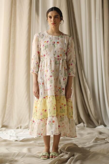 Ivory,lemon tiered dress with watercolor floral printed motifs & frill detailing. Comes with cotton slip.