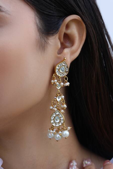 Gold plated, silver alloy tear drop shaped earrings in kundan encrusted design with dangling pearl embellishment.