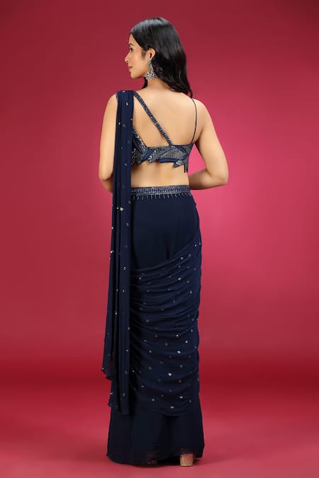 Blue pre-draped saree featuring scattered sequin embellishments and a pre-draped silhouette. Paired with a cropped embroidered blouse with scalloped hem detailing.