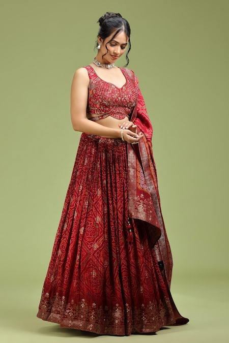 Red lehenga set featuring an embroidered sleeveless blouse and a flared printed lehenga. The matching dupatta completes the ensemble.