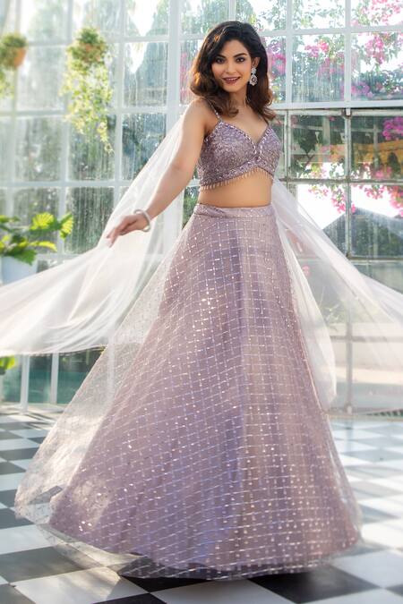 Mauve checkered texture lehenga with attached cancan. Paired with a self-colored strappy indo western padded choli with attached cape sleeves.