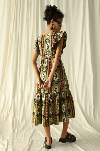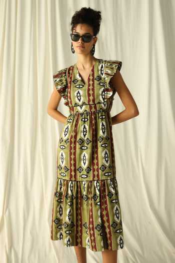 Green Cotton V-neck Chamba Abstract Floral Print Dress