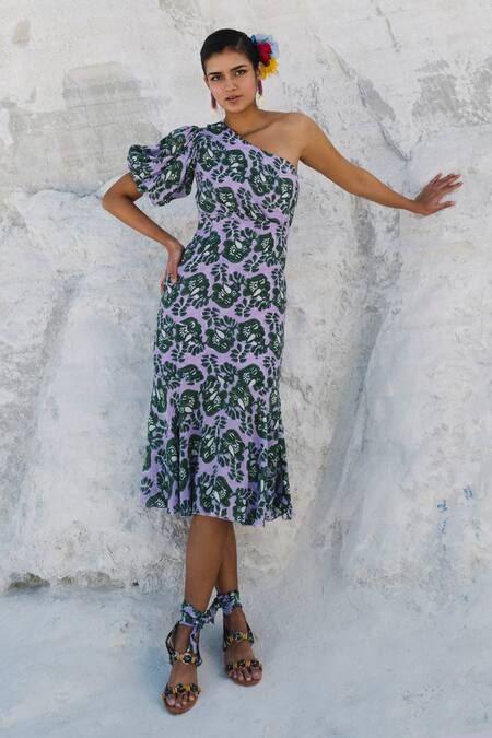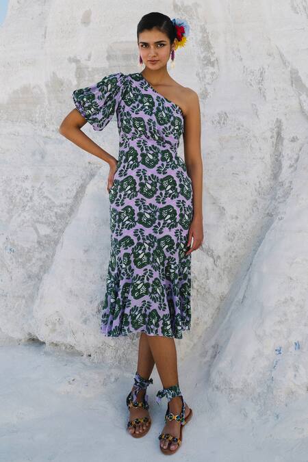 Multi Color Modal Asymmetric Dia One Shoulder Printed Dress