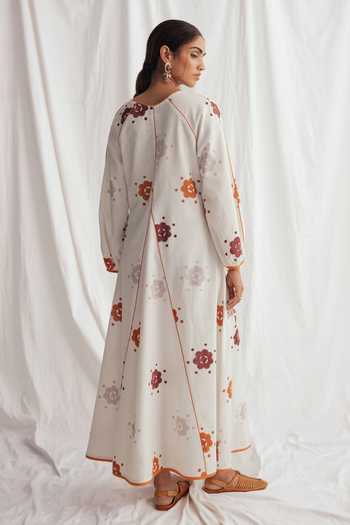 Hand block printed fabric, Rust piping along panels, Flared maxi silhouette