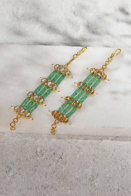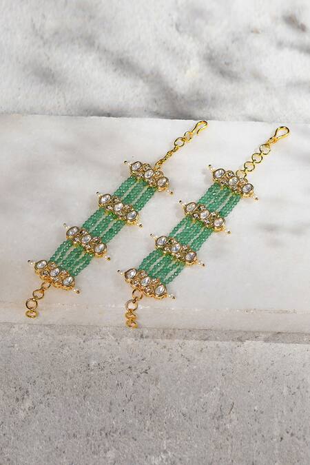 22 Kt gold plated ear chains with kundan polki and green agate beads embellishments.