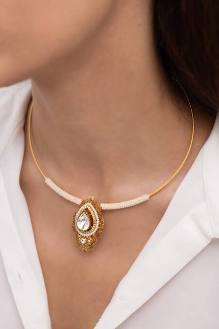 Gold finish necklace featuring a central teardrop stone with intricate embellishments