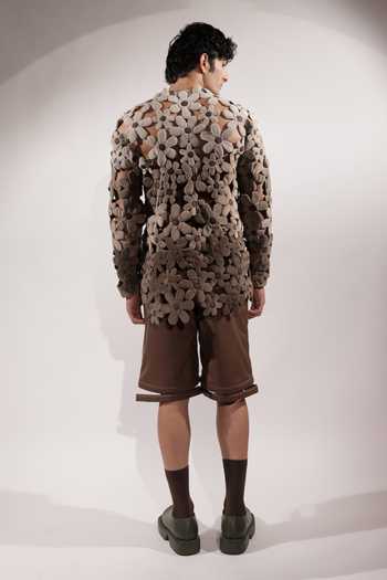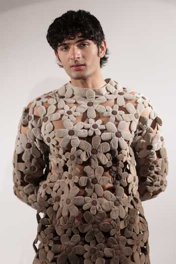 Beige suede sweatshirt with 3D quilted floral appliqué and brown leatherette detailing.