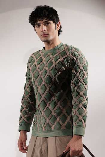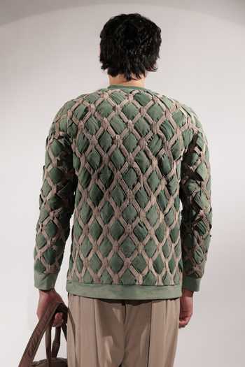 Green suede sweatshirt with beige interwoven lattice panels and woven work.