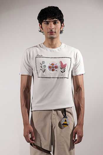 White 100% Cotton Tshirt with floral motifs & embroidery.