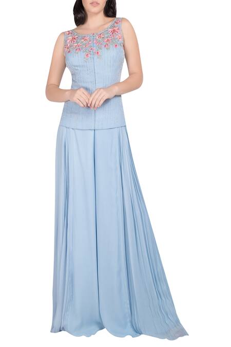 Blue Embroidery Embellished Top With Pleated Palazzos