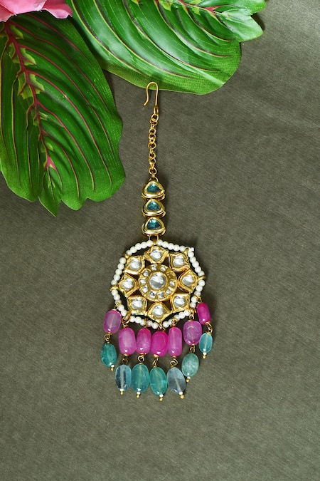 Multi color maangtikka featuring a geometric pattern with beads, kundan stones, and pearl embellishments