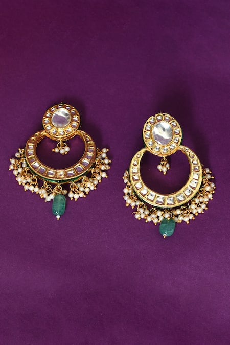 Gold tone chandbalis featuring intricate kundan work, adorned with pearls and green beads