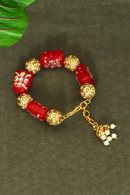 Gold bracelet featuring a geometric pattern with beads, kundan stones, and pearl embellishments