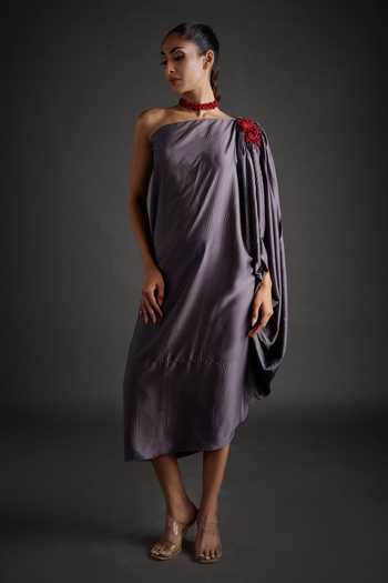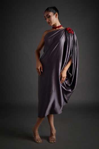 Grey Satin, Lycra Asymmetric, One Shoulder Draped Dress