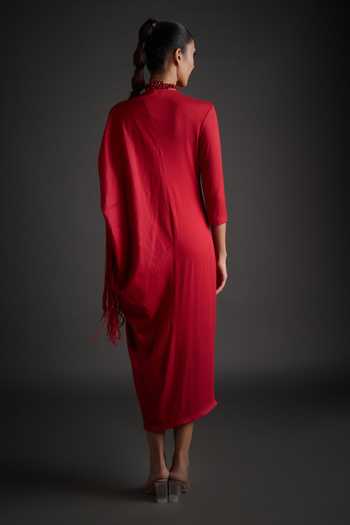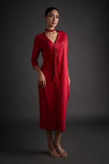 Red Giza Cotton And Modal Cotton Lycra dress with front bead tassel embellishment.