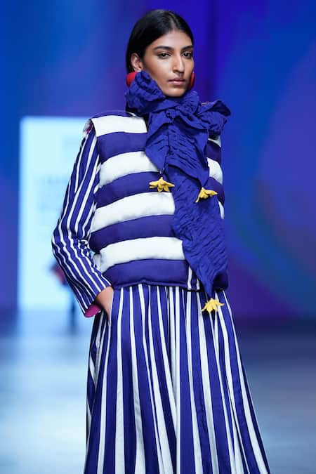 Shop_KA-Sha_Blue Silk High Neck Striped Puffer Jacket _Online_at_Aza_Fashions