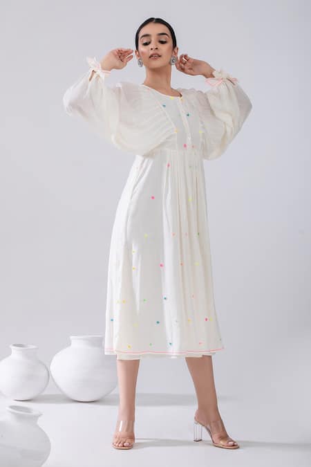 Ivory midi dress featuring balloon sleeves and a round neckline