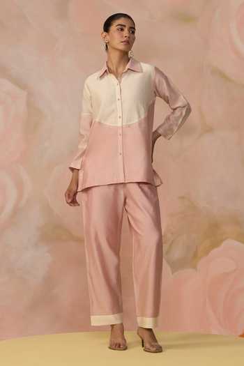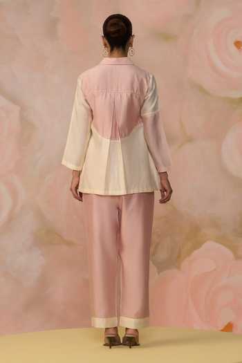 Pink Chanderi Collared Color Block Shirt And Pant Set
