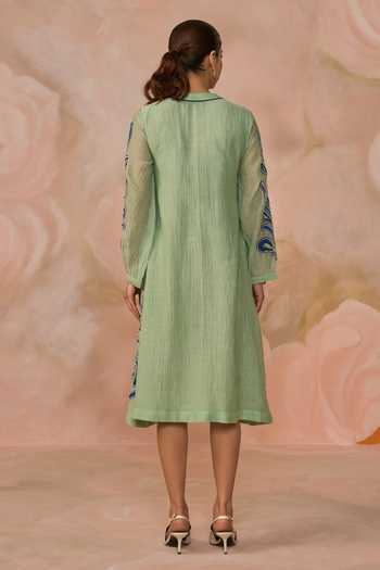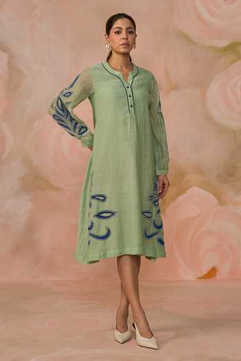 Green Chanderi Split V-neck Hand Embroidered Dress