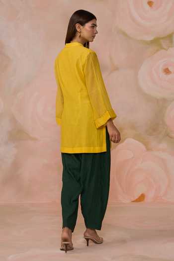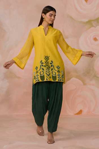 Yellow Chanderi kurta with geometric patchwork and delicate beadwork. Paired with a Dhoti pant.